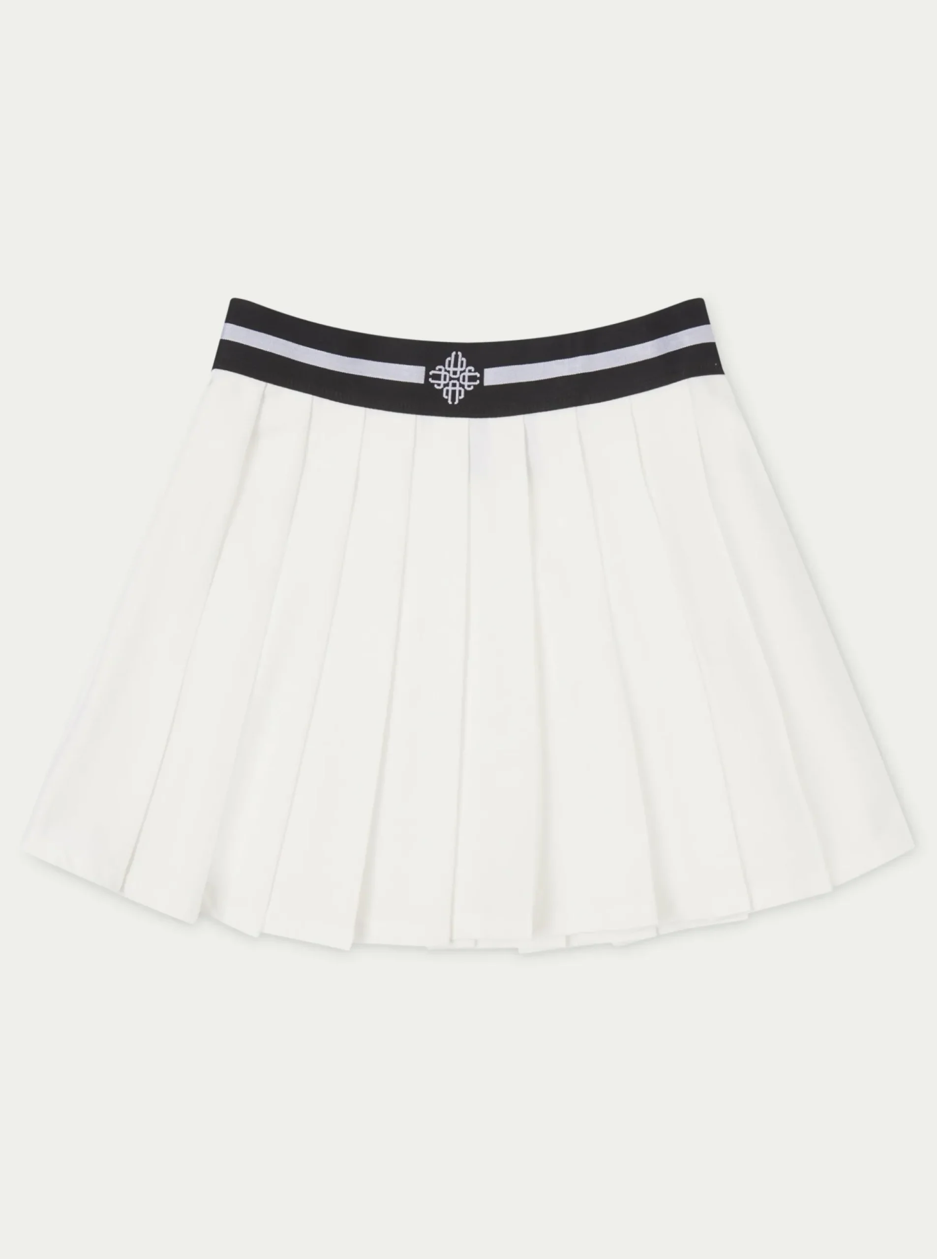 Colour: White- High Waisted Mini Skirt Fit- Pleated- Invisible Zip Detail To Side Seam- Branded Soft Jacquard Elasticate…